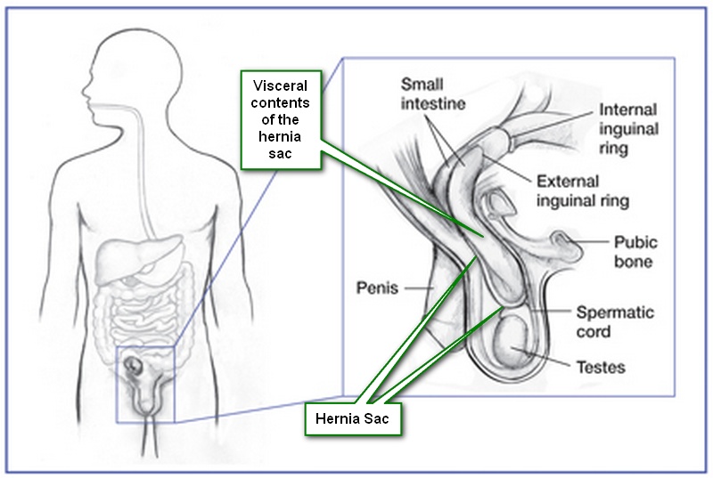 UPDATED: The definition of hernia is "the protrusion of a deep structure through a superficial weakness of defect".