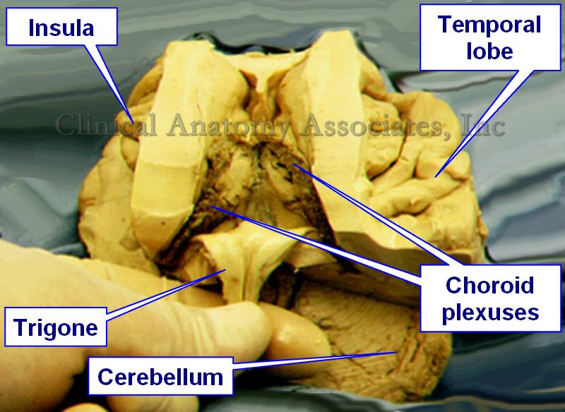 The choroid plexuses are found in each ventricle of the brain. The accompanying image shows a dissection of a human brain where the frontal, parietal, and occipital lobes, as well as the corpus callosum have been removed to expose the lateral ventricles. The trigone has been transected and reflected posteriorly and the choroid plexuses can be seen as a cluster of grape-like longitudinal masses in each lateral ventricle.