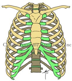 The thorax is the region of the trunk found between the neck superiorly and the abdomen inferiorly. It is characterized by a bony cage (thoracic cage). It is bound anteriorly by the sternum, laterally by twelve pairs of ribs and corresponding cartilages, and posteriorly by the thoracic spine, composed by twelve thoracic vertebrae.