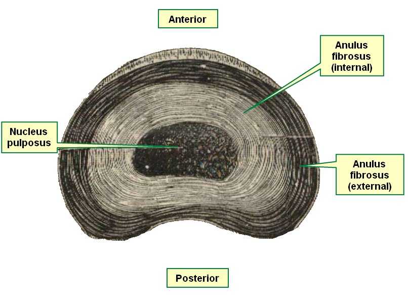 Many structures in the human body have a lamellar organization, such as compact bone, the pubic symphysis, and intervertebral discs. The accompanying image is a superior view of an intervertebral disc. Click on the image to see a larger depiction and the lamellar structure of the anulus fibrosus, the external component of the disc.